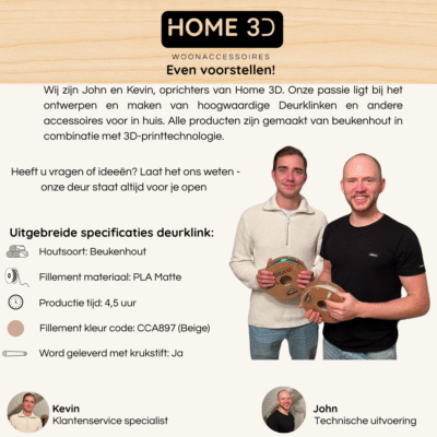 Op zoek naar een moderne touch voor je binnendeuren? Dan is de Home 3D deurklink echt iets voor jou! De deurklink is gemaakt van beukenhout, ontworpen én gemaakt in Nederland. Het strakke design past perfect in elk interieur en geeft je deur een frisse uitstraling. Upgrade je huis met deze stijlvolle deurkruk!